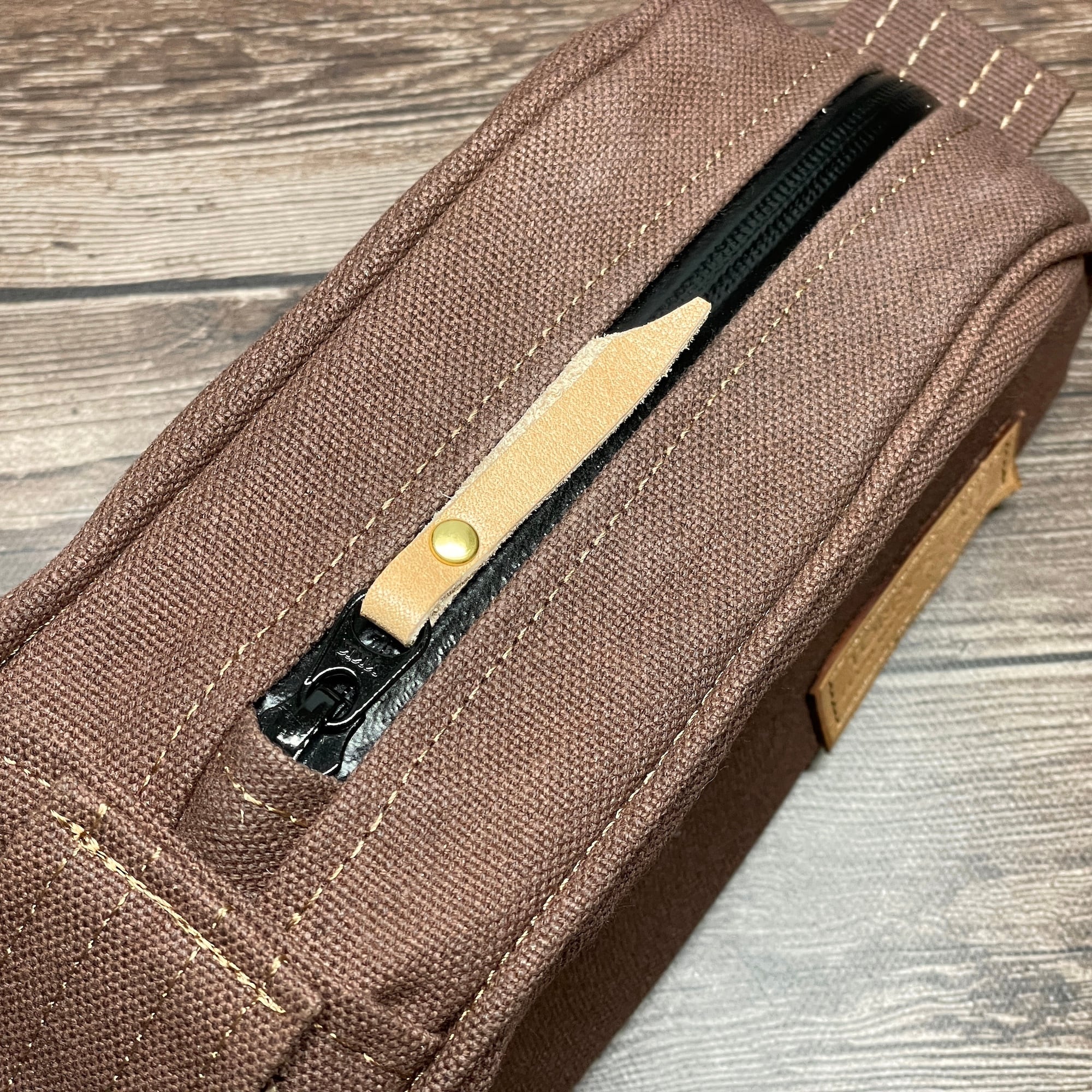 材質:8号帆布(パラフィン加工済)、ナイロン(裏地)、革(タグ、ファスナー引手、中敷き)